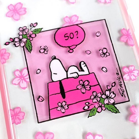 中央には、お馴染みのドッグハウスの上で寝そべるスヌーピー。舞い落ちる桜の花びらを眺めているのでしょうか。