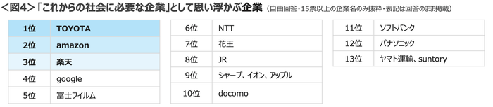 「これからの社会に必要な企業」として思い浮かぶ企業を自由回答で聴取した。15票以上で回答の多かった企業は、「TOYOTA/amazon/楽天/google/富士フイルム/NTT/花王/JR/シャープ/イオン/アップル/docomo/ソフトバンク/パナソニック/ヤマト運輸/suntory」であった。(表記は回答のまま掲載)<図4>