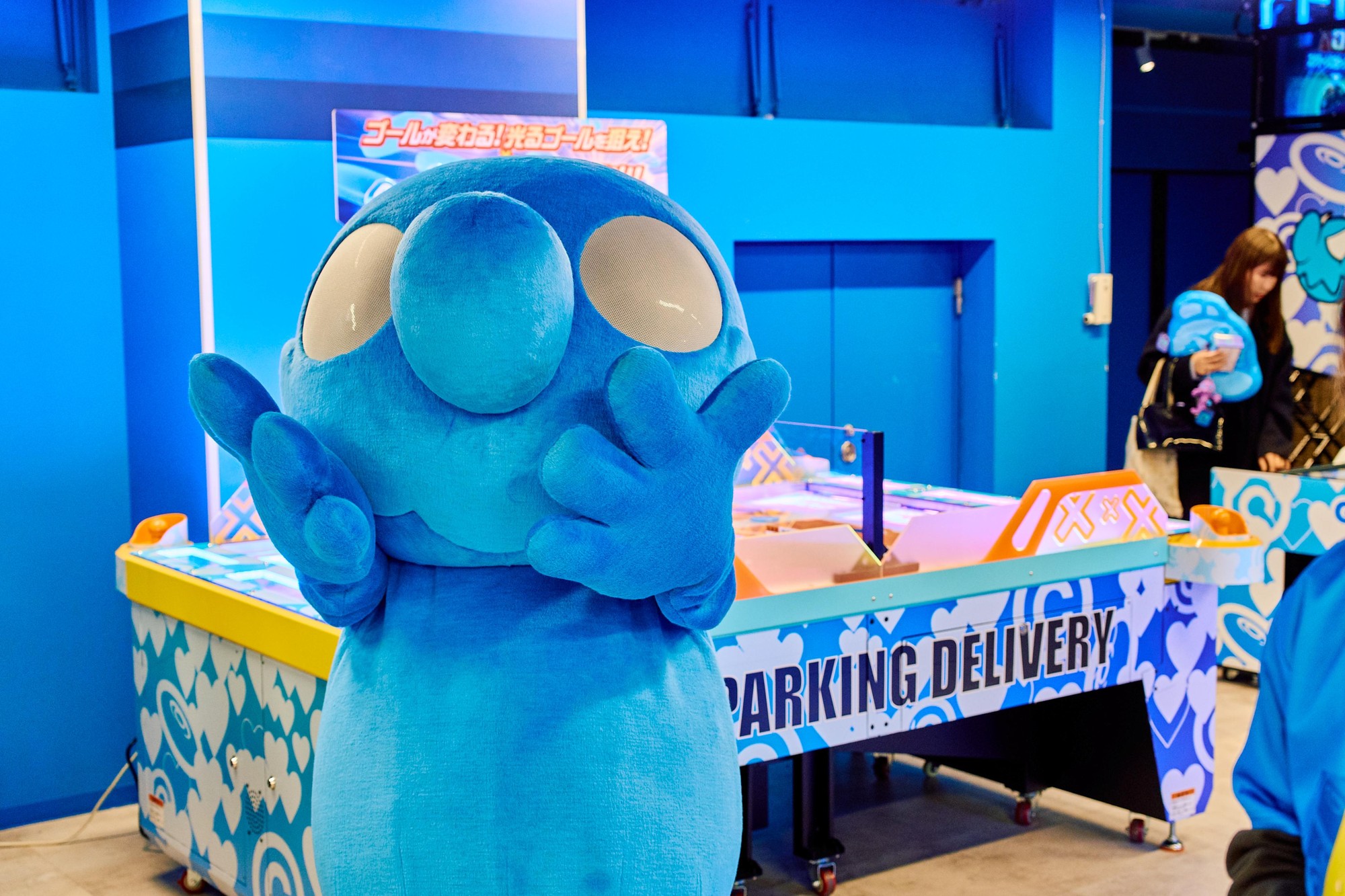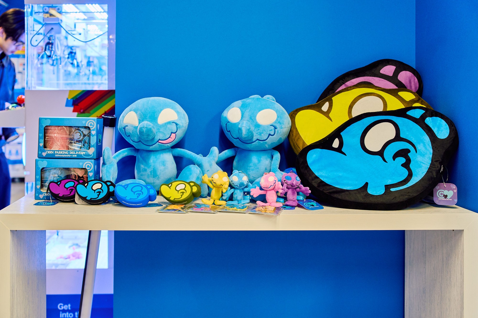 コラボグッズはBIGぬいぐるみ、マスコットぬいぐるみ、フェイスクッション、ラバーマスコット、ミニフィギュア、シリコンポーチ、ステンレスタンブラーセットの計7点を展示。特に「白井さん」のBIGぬいぐるみは会場に集まったゲストから大好評となり、即時品切れになりました。また、クレーンゲームはCOIN PARKING DELIVERYデザインの特別仕様で、現在GiGO渋谷、GiGO大阪道頓堀本店のみに設置されています。