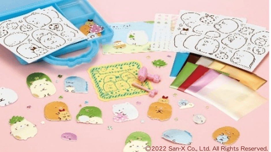 すみっコぐらしのキャラクターシールは、全部で62個作れる。「貼ってはがせるシール台紙」「作業シート」「収納ケース」にもすみっコぐらしのキャラクターがデザインされています。