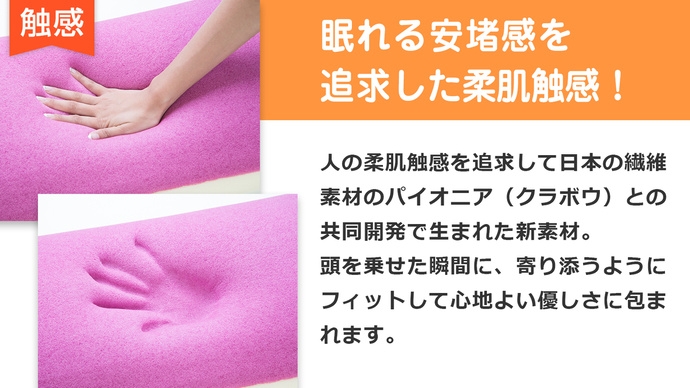 柔肌の触感を追求し、快適性を兼ね備えたクラボウが開発した素材、レジェンドフォーム®。枕で重要となる頭を乗せたときの柔肌感触と包み込まれる安堵感を実現。広い面積で支えると同時に、吸い付くように首や肩の隙間を埋めてフィットします。