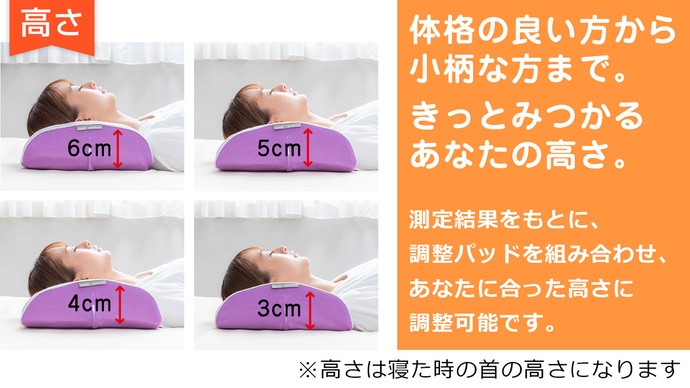 セット内容:枕本体、高さ調整シート2枚(約2cm×1枚、約1cm×1枚)、専用枕カバー、取扱説明書、オリジナル測定器(組み立て式)
