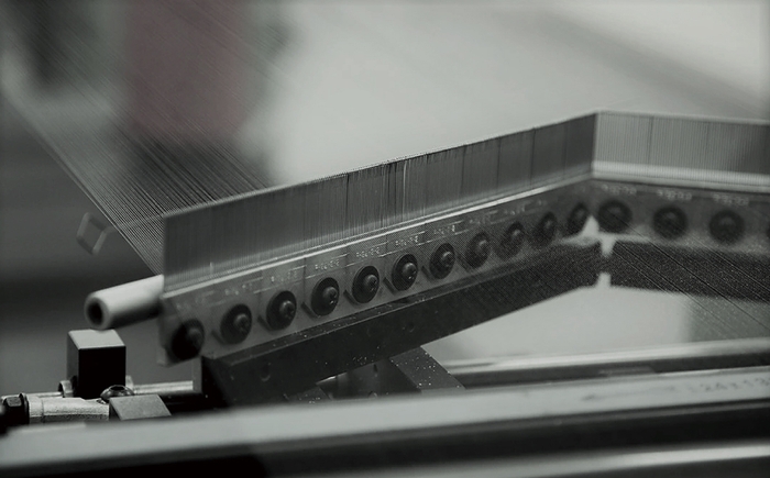 クーリオが採用している編み組織は、トリコット(経編み)と丸編み(横編み)をドッキングさせています。ニットなのにタテとヨコと両方の糸が入って、まるで布帛のよう。その唯一無二な技術でつくられた生地は、編物の落ち感・伸縮性と、織物のハリ・仕立て映えさをベストなバランスで合わせもった逸品です。