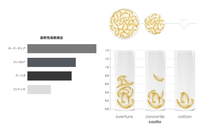 オリジナルで製造したCOOLIO(クーリオ)の強撚糸は、「清涼感」に優れた植物系再生繊維のキュプラを多く使用しています。キュプラは、繊維中に水分を多く含むこと、熱伝導率・熱拡散率が高いことなどが影響しており、COOLIO(クーリオ)の強撚糸は、繊維に触れると肌から繊維へ瞬間的に熱が移動して、冷たく感じるようにつくられています。