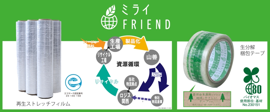 株式会社山善(本社:大阪市西区/代表取締役社長:岸田 貢司 以下、当社)は、環境配慮商品の新ブランド『ミライFRIEND(フレンド)』を立ち上げました。ブランド第一弾となる「再生ストレッチフィルム」を2024年5月上旬より、第二弾「生分解梱包テープ」を2024年5月中旬より、当社が運営するインターネット通販サイト「山善ビズコム」やECモールの「くらしのeショップ」などで順次発売いたします。
