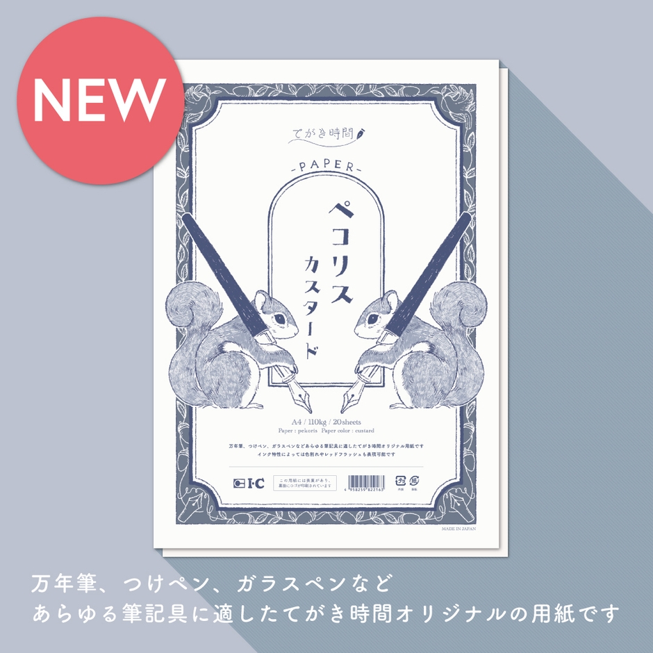 “てがき時間 ペコリス カスタード”は、アイシーの人気商品・アイシー漫画原稿用紙の素材を活かした万年筆、つけペン、ガラスペンなどあらゆる筆記具に適した『てがき時間』オリジナルの用紙です。