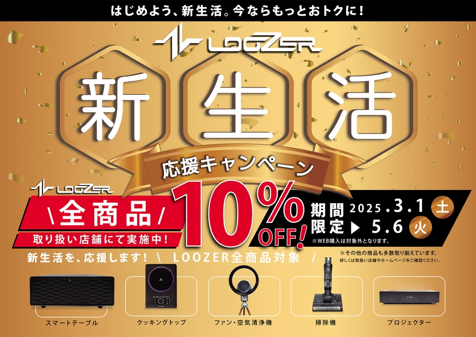株式会社ロイヤル(本社:名古屋市中区、代表取締役社長:中根 智大)は、ステルス家電の代名詞でもある「LOOZER(ルーザー)」のブランドの全商品を対象とした、新生活応援キャンペーンを2025年5月6日(火)まで実施。ECを除く、LOOZERブランドの取扱い全ての店舗で実施しており、LOOZERブランドの代名詞でもあるスマートテーブルを筆頭に、全ての商品が対象となっているため、これからの新生活などに向けて家具家電の購入を検討している方々には必見のキャンペーンです!