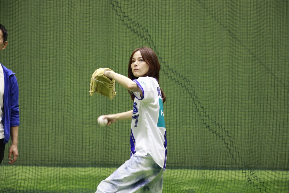 Hisenseロゴとご自身の名前がプリントされた特別ユニフォームを着用して室内練習場にやってきた相川さんは、投球練習に向けて入念に肩と腕のストレッチを行ない、「よし!行きましょう!」と気合い十分の様子。早速、始球式前の最終調整のためピッチングを始めると、一球目から勢いのあるボールを投げ、始球式に向けて上々な仕上がりを披露しました。上の方を目がけて投げることや肩の使い方のアドバイスをもらいながら、1球1球丁寧に投球を重ね、ついにノーバウンドでキャッチャーまで届くと、笑顔を見せる場面も。投球練習後には、キャッチャーからこれまでで一番いいボールが来ていたと声をかけられるなど、本番でノーバウンドピッチングを果たすべく、万全な準備を行なっていました。
