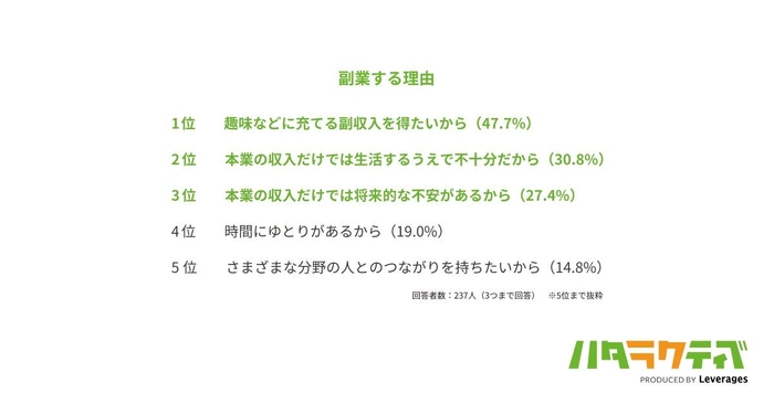 1位の「趣味などに充てる副収入を得たいから(47.7%)」と2位の「本業の収入だけでは生活するうえで不十分だから(30.8%)」では約1.6倍の差があり、生活に困っているから副業をするよりも、より自分の生活を豊かにするために副業をしている人が多く見受けられます。
