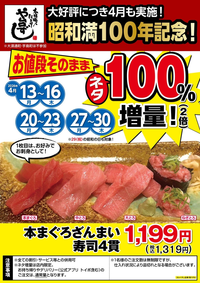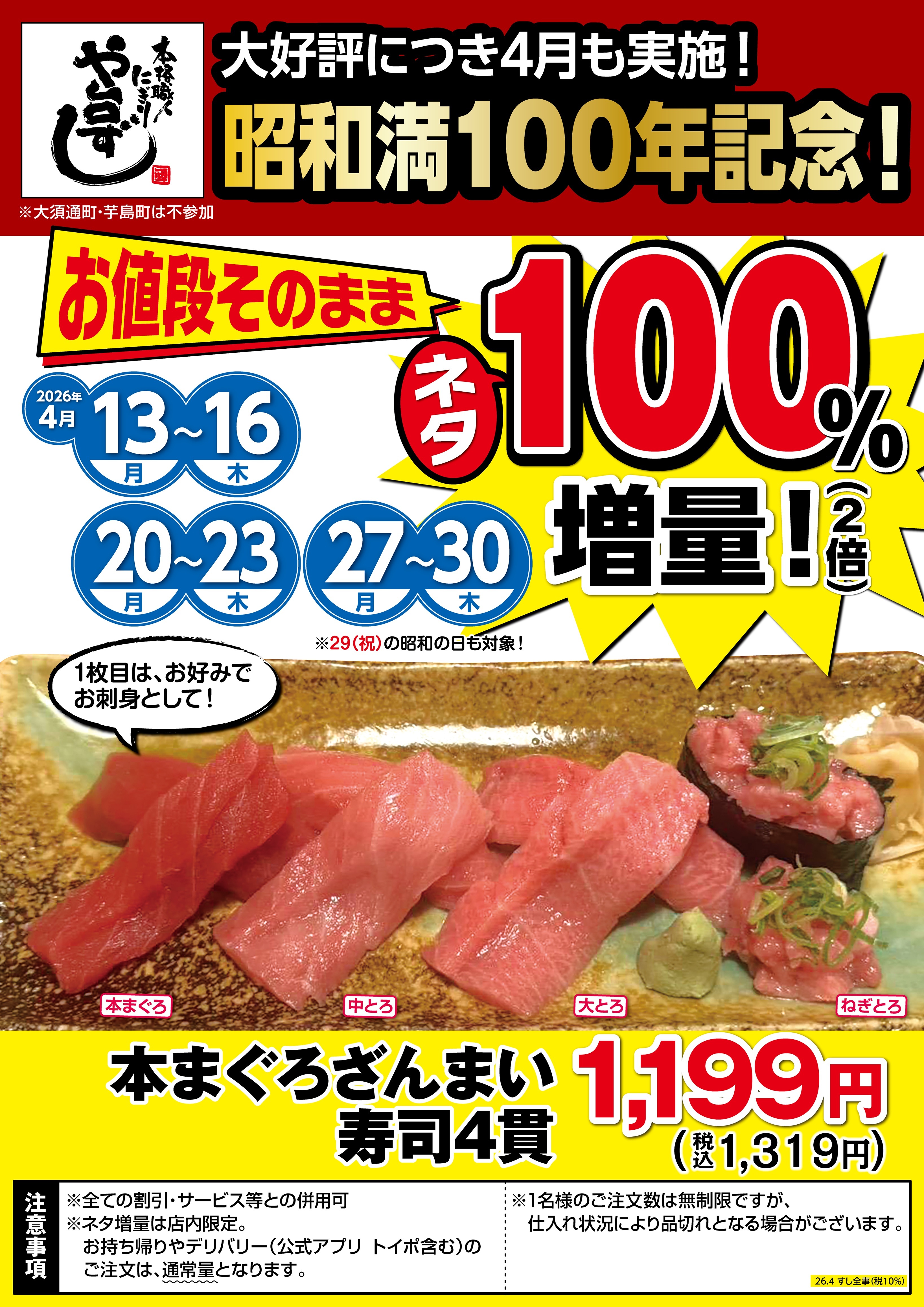 昭和満100年を記念して! 本格職人握り寿司居酒屋「や台ずし」が 本まぐろざんまい寿司4貫のネタ100%増量キャンペーンを 税込1,319円で2026年4月13日(月)~16日(木)、 20日(月)~23日(木)、27日(月)~30日(木)の計12日間限定実施!