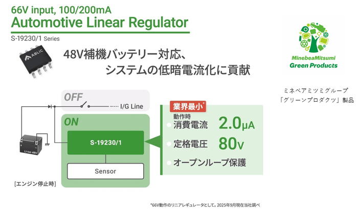 本日発売した「S-19230/1シリーズ」は、入力電圧の耐圧が80Vと高いため48V、24V、12V補機バッテリーのいずれにも対応した製品です。また、常時動作が必要なセンサや、CAN/LINトランシーバーへの電源供給において、業界最小(※1)2.0μAの低消費を実現しシステムの暗電流(※2)削減に貢献します。