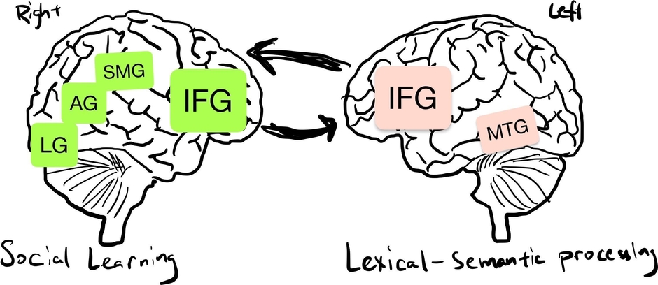 ※左は脳の右半球。Social Learning(社会的学習)に関わる脳領域を示している。IFG:下前頭回(かぜんとうかい)、SMG:縁上回 (えんじょうかい)、AG:角回 (かくかい)、LG:舌状回(ぜつじょうかい)