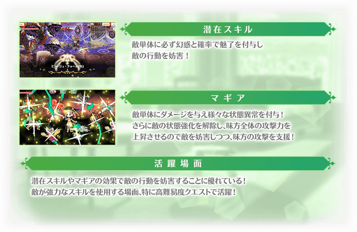 スキルで「毒」や「幻惑」といった状態異常を付与してくるため、敵のスキルを妨害する「スキル不可」や、付与された状態異常を解除、もしくは状態異常耐性をUPし状態異常を防ぐコネクトやマギアを持った木属性の魔法少女を編成、またはメモリアを装備することが有効です。