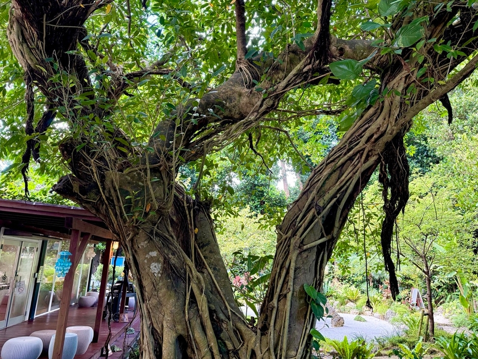 こうした中で“フクギの記憶を継ぐ場所”として注目されているのが「備瀬のあそびば」です。敷地内には備瀬最古とされる樹齢300年のフクギが静かに佇み、地域の歴史と自然を象徴しています。さらに、フールーやガジュマルの仲間である“ハートの木”も共生しており、枝同士がつながる不思議な生命力を宿すこの木は、アニメ『ラブライブ!虹ヶ咲学園スクールアイドル同好会』のライブステージとしても登場し、物語性と感動を添える撮影スポットとなっています。
