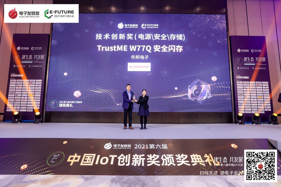 台湾台中市発 - 2021年12月13日 - 半導体メモリソリューションの世界的大手サプライヤーであるウィンボンド・エレクトロニクス株式会社は本日、TrustME(R)W77Qセキュアフラッシュメモリが2021 China Elecfans IoT Technology Innovation Awardsを受賞したことを発表しました。