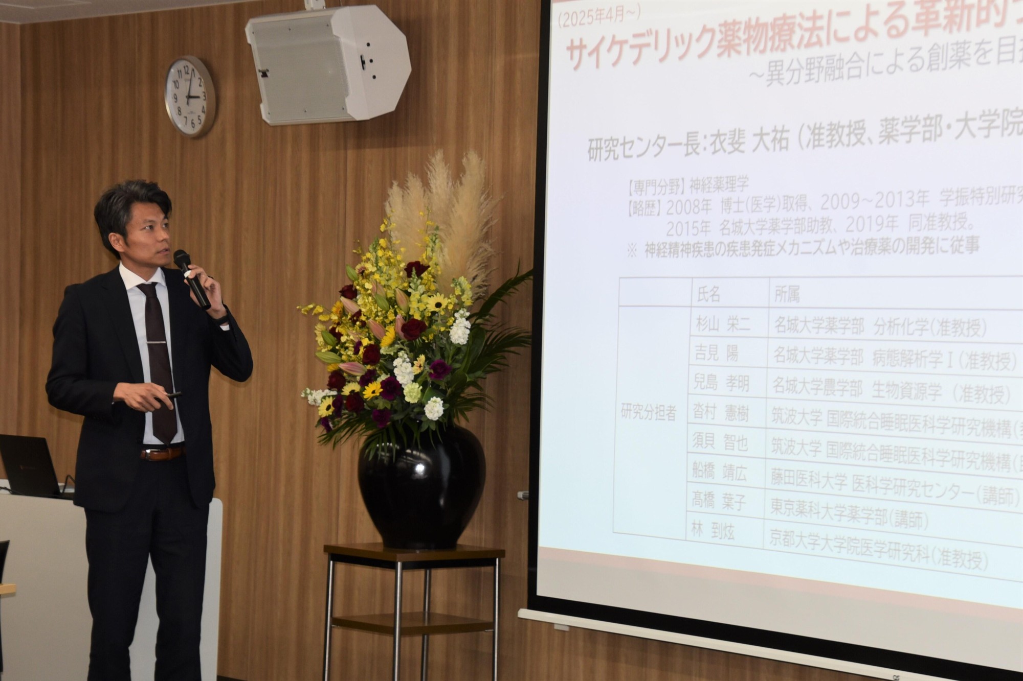 パネルディスカッションは小髙所長がコーディネーターを務め、佐川特任教授に加え、光デバイス研究センター長の竹内哲也理工学部教授とメディカルAI研究センター長の寺本篤司情報工学部教授、サイケデリック薬物療法による革新的うつ病治療センター長の衣斐大祐薬学部准教授がパネリストとなり、初めに小髙教授が総合研究所の歩みや概要、各センター長がそれぞれの研究センターの研究目的や成果と課題などを説明しました。