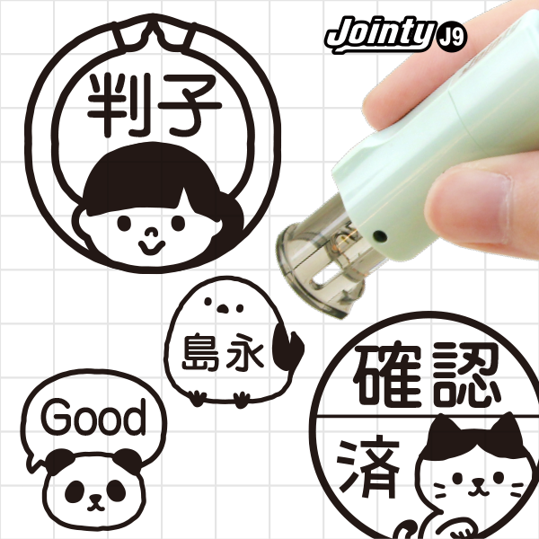 キャップレスで軽い押し心地の回転式ネーム印「Jointy J9」を採用。浸透印ではなくゴム印タイプのため、 イラストの細かい部分も鮮明に表現できます。持ち歩きしやすい工夫がされており、スタンプ台内蔵で連続押印してもかすれません。