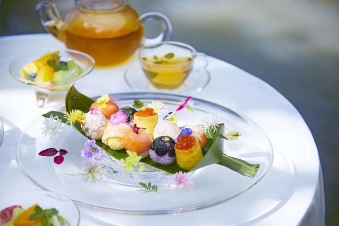 水面に見たてたガラスの器に、鮮やかなてまり寿司、エディブルフラワーを散りばめ、水面をサガリバナが埋め尽くす情景を表現します。サラダやフルーツ、ジャスミン茶の器もすべてガラスで統一しているため、テーブルの上にいくつもの水紋が広がっているようです。器に光が差すと、影が波紋のようにひらき、目の前の情景と重なります。視覚でも楽しめる、美しく彩り鮮やかな可愛い朝食です。