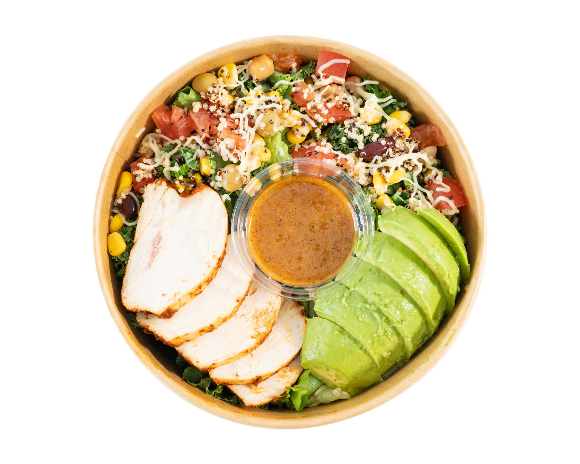ケイジャンスパイスを効かせ香ばしくグリルしたチキンに、アボカドを豪快にトッピング。スーパーフードとして人気のキヌアを加え、香ばしく炙ったトウモロコシ、トマト、ケール、レタス、チーズなど、色鮮やかな食材をバランス良く組み合わせました。