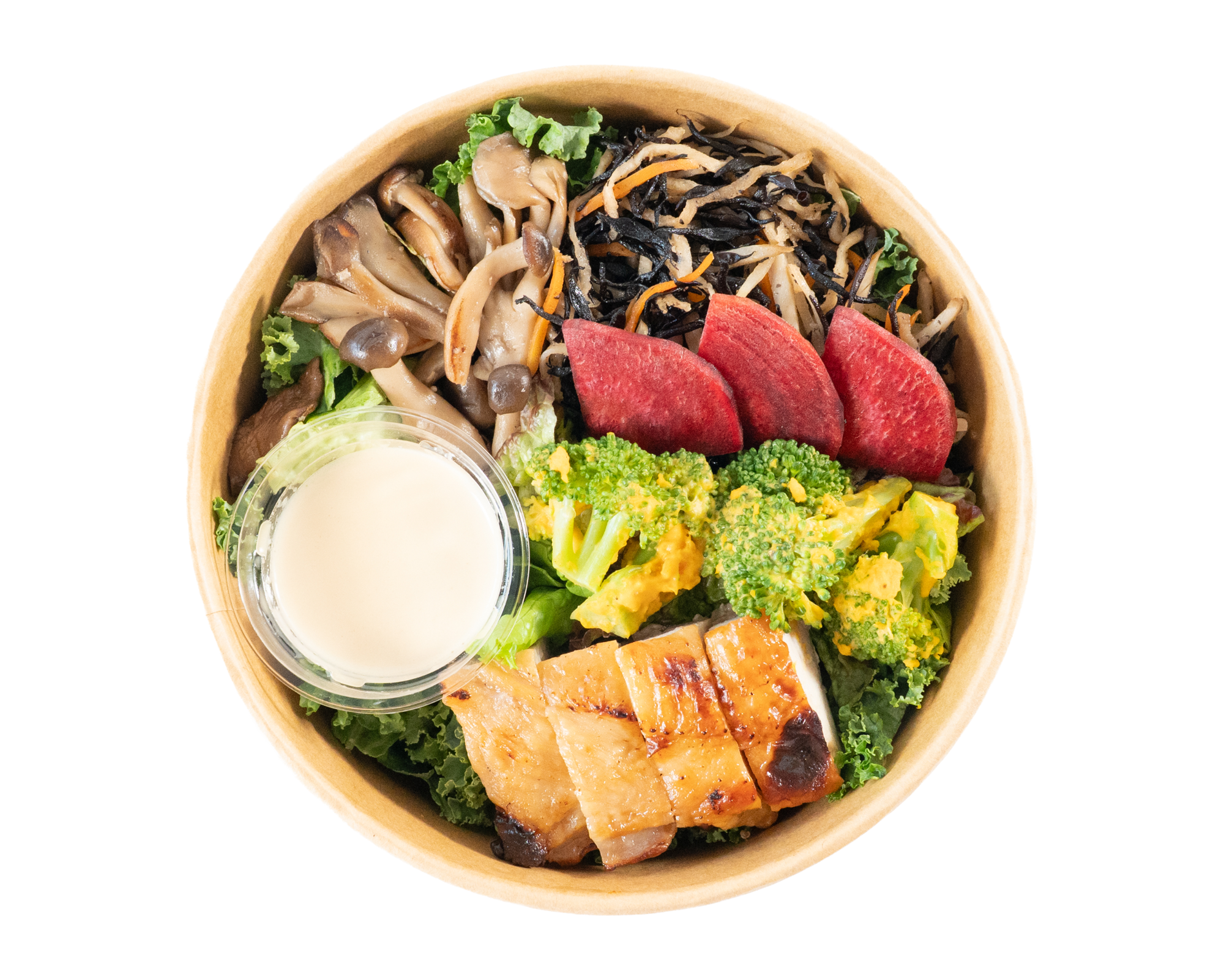 ヨーグルトでじっくりマリネし、やわらかく仕上げた照り焼きチキンが主役。 塩麹で旨みを引き出した食物繊維たっぷりのきのこに、切り干し大根やひじきを加えた塩きんぴらを添えた和風のサラダです。