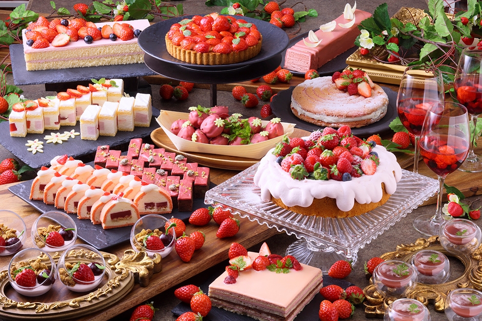 たくさんのいちごスイーツに囲まれて、幸せな気持ちで心が満たされるスイーツビュッフェをお届けいたします。こんもりといちごが乗った「いちごタルト」は、ひとくちごとに紅茶の芳醇な香りといちごの甘みが広がる一品。たっぷりの零れ落ちるクリームとたくさんのいちごやラズベリー、ブルーベリーなどが迫力のある「いちごキャラメルシフォン」、柔らかくふわっとした淡いピンクの生地に羽をモチーフにしたホワイトチョコレートを乗せた「いちごスフレケーキ」などをご用意しています。