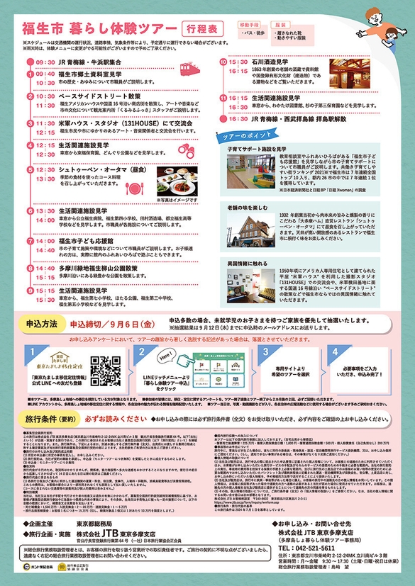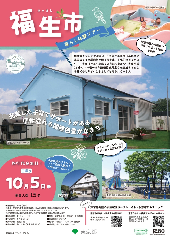 本事業は、東京都が実施する「移住後の生活をイメージできる」ことをコンセプトとしたツアーの福生市版で、市民や関係者との交流や子育て関連施設の見学などを行います。当日は市職員もツアーに同行し、ほかにはない「和と洋」が織り成すまち、「住んで良し」の福生市をエスコートします。