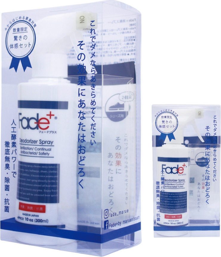 Fade+(フェードプラス)消臭剤シリーズは、頑張って走ったあとの爽快感や感動、達成感のそのあとにお役立ちできる消臭剤。人工酵素が悪臭物質に直接作用し、気になるニオイを分解消臭。限りなく無臭に近づけます。