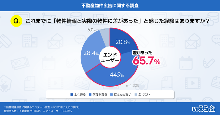エンドユーザーへの「物件情報と実際の物件に差があったことはありますか?」という質問では、「よくある」が20.8%、「何度かある」が44.9%となりました。