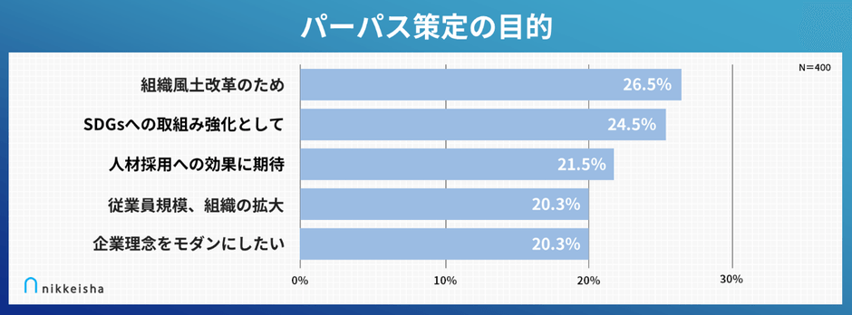 日本経済新聞社グループの中核広告会社である株式会社日本経済社(本社:東京都港区、代表取締役社長:北村 真一郎)は、エスエムオー株式会社(東京都港区、代表取締役:齊藤 三希子)と共同で、昨年12月に、企業のパーパス策定関与者400名を対象とした【パーパス策定に関する実態調査】を実施しました。近年企業経営においてパーパスの策定が注目されています。先が見えない不確実な時代において、企業のパーパス=存在意義を明確にし、社内外に浸透させることで、より強い組織、強い企業のブランドを作りあげていく、そういった企業が増えています。そこで今回は、実際にパーパスを策定した企業の関与者400名に対して、策定に関して様々な視点から調査を行い、課題やポイントを明らかにしました。