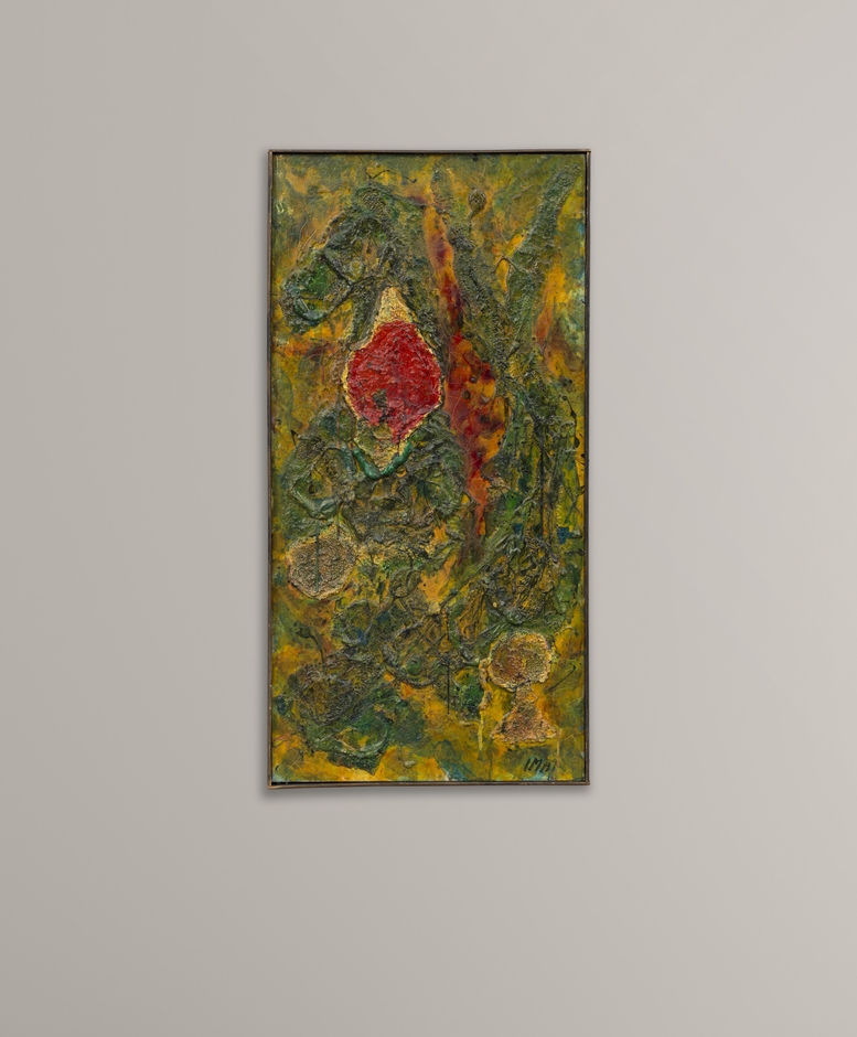 美術評論家ミシェル・タピエとの交流からヨーロッパにおけるアンフォルメル運動を日本へ紹介した功績が語られる作家ですが今回出品される作品は1961年作、日本とフランスを行き来しながら活発な制作活動をしていた時代のものです。厚く塗り重ねられた色鮮やかな顔料が目をひく一点です。
