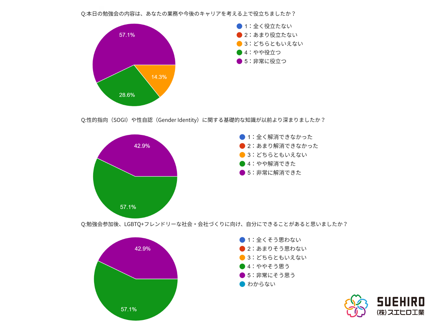 ・スエヒロ工業で行っている取り組みを発信していくこと自体もうれしい、と講師の方がおっしゃていたのが印象的でした。アライであることを示すことへの疑念はなくなりました。安心な場所であるということを分かるように示すこと、示し続けることをしようと思いました。