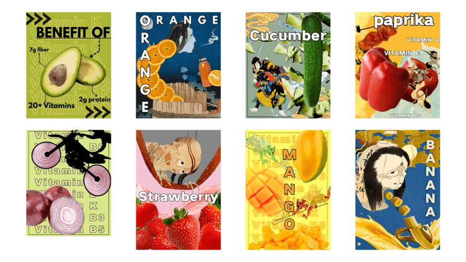 さらに、マンゴーやアボカドを描いたポスターには、背景に栄養素やビタミン成分がグラフィカルに配置されるなど、健康意識や情報性を感じさせる工夫も施されています。伝統とモダンが調和したその表現は、広告としてだけでなく、日常に寄り添う“機能するビジュアル”としても評価されています。