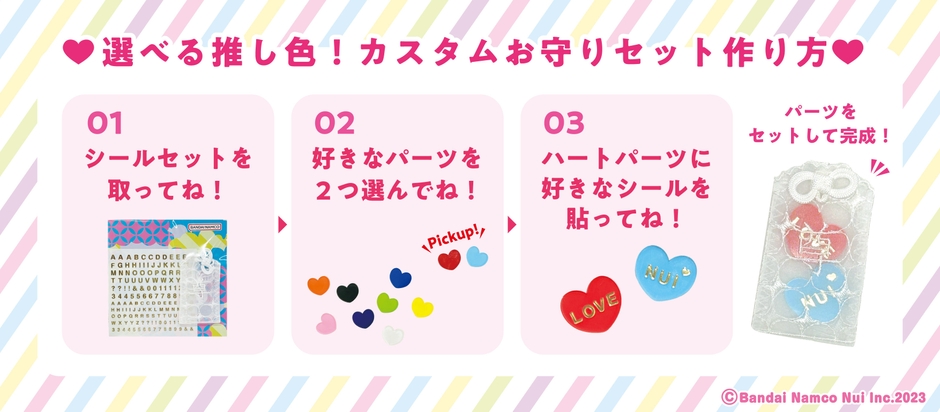 株式会社バンダイナムコヌイ(本社:東京都台東区、代表取締役社長:春山 ゆきお)は、好きな色を選んで自分好みのお守りを作れるセット「選べる推し色!カスタムお守りセット」をバンダイナムコ Cross Store 東京 内の「Shopぬい出張店」にて2024年3月4日(月)より数量限定でテスト販売します。(発売元:株式会社バンダイナムコヌイ)