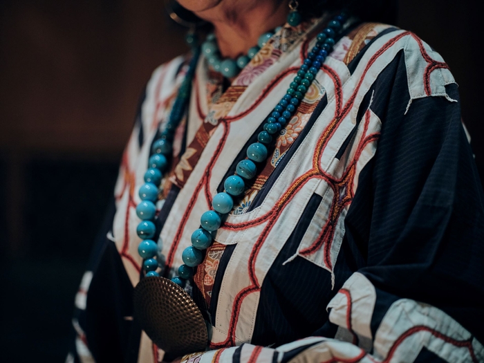 アイヌ文化の口承文芸で受け継がれる物語や歌には多くのジャンルがあります。代表的なのはユカラやカムイユカラ、ウポポやイフムケです。それらの口承文芸に見られる特徴や文化の背景を学びます。また、形式的な話のみにとどまらず、これまでの人生でどのように歌を伝えてきたかといった伝承者自身の歩みや今の想いといった踏み込んだお話にも耳を傾けます。参加者も自由に質問ができ、時には、着用しているアイヌ衣装や装飾品にほどこされた模様の意味合い、誂えたときのエピソードに話が及ぶなど、直接対面で、手ほどきを受けるからこそ分かる文化のありのままの姿に、触れることができます。