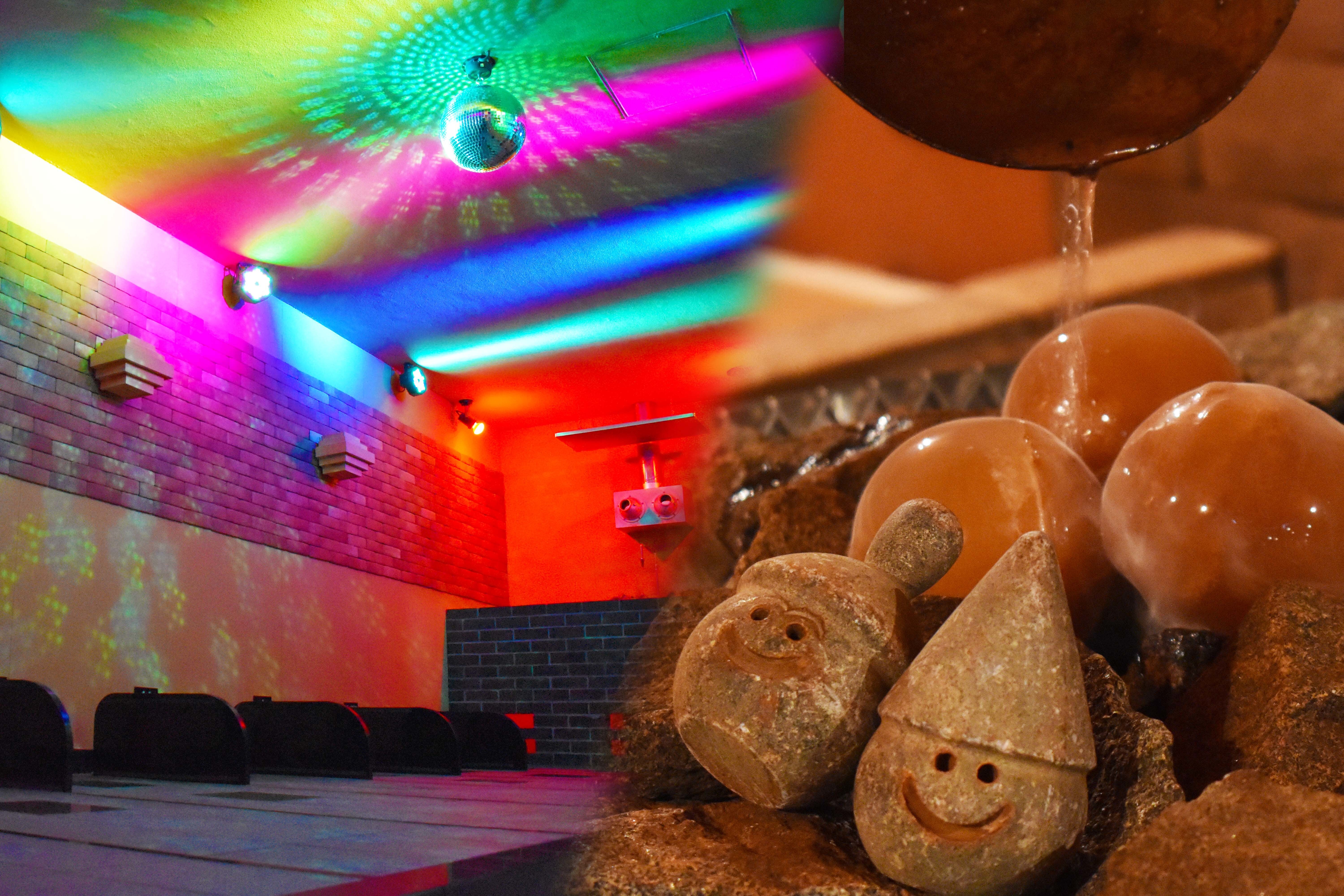 さらに、七色に光るステージライトとミラーボールで室内を照らすことにより、視覚でもお楽しみいただける新感覚の岩盤浴です。
