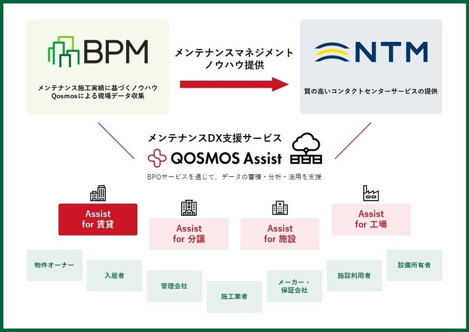 コンタクトセンター・フルフィルメントセンターを運営する日本トータルテレマーケティング株式会社(本社:東京都渋谷区、代表取締役社長:森 真吾、以下「当社」)は、建物・設備の維持管理を担う“メンテナンス業界”のDXを支援するBPM株式会社(本社:東京都千代田区、代表取締役:桐原 康輔、以下「BPM」)との共同運営を開始しました。今後両社は、建物・設備メンテナンス業における施工履歴データの蓄積・分析・活用を支援する、業界特化型のDX支援サービスを提供してまいります。
