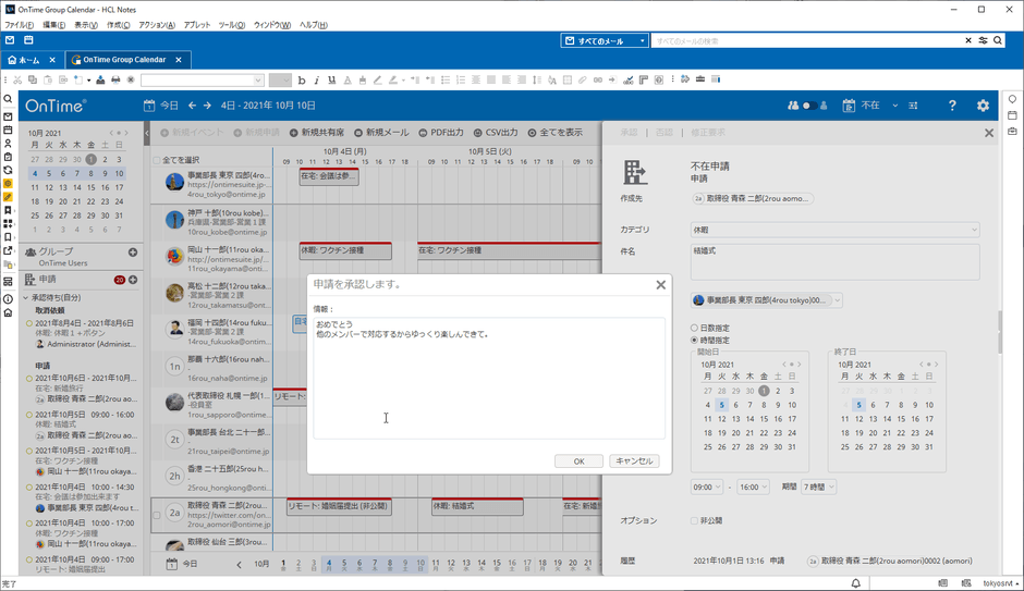 リモートワーク、出張、休暇などオフィスを不在する際に仕事を共にしているメンバーに事前に通知できる機能です。基本的な差戻しや変更依頼などは備えていますが、本格的な多段階層によるワークフローではなくあくまでもワークシェアするメンバーに通知することを主目的とした簡易ワークフローです。OnTimeならではの機能として申請者も通知を受けた人もお互いの予定を俯瞰しながら相互に希望日時の確認や予定の調整が出来ます。本機能は管理者が特定のグループ毎に利用を有効化することが可能です。