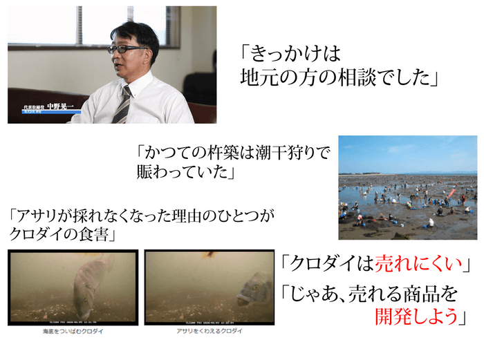大分県杵築市にある守江湾は昔からアサリの好漁場でした。近年はカキを養殖し地域の特産品にもなりカキ街道といわれる国道沿岸道路沿いにカキ小屋が何件もあります。しかし、近年、アサリの数が激減し、地元漁協を中心に稚貝をまいて数を増やす取り組みをしていますが効果が見られませんでした。その原因として、汚染や環境の変化が考えられましたが一番の大きな原因が黒鯛(チヌ)食害が大きな原因だとわかりました。黒鯛(チヌ)は好んでアサリの稚貝や成貝の補食、また特産品の養殖カキもかじり生産量が減少していたのです。漁協などの研究調査で稚貝を巻いたところに網を張って食害を防止した結果、多くの丸々としたアサリが育ちました。今回、当社はそのあまり利用されていない黒鯛(チヌ)を杵築市の特産品にできないかと考えできるだけ食べやすい商品に加工しました。黒鯛は真鯛と違い少しだけ味に癖がありそれは黒鯛の味としての特徴でもありますが、より女性や子供たちに食べてもらいやすくする、また黒鯛の美味しさを実感できる商品としてまぜ飯の素として加工することにしました。