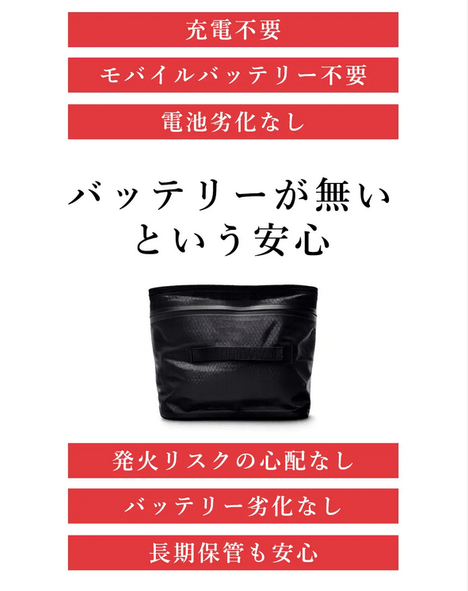 同社は安全性と利便性を両立させた圧縮メカニズムの開発に注力、発火リスクや危険性を抑えながらも「誰もが携帯している外部電力」としてスマートフォンからの電力供給に注目しました。