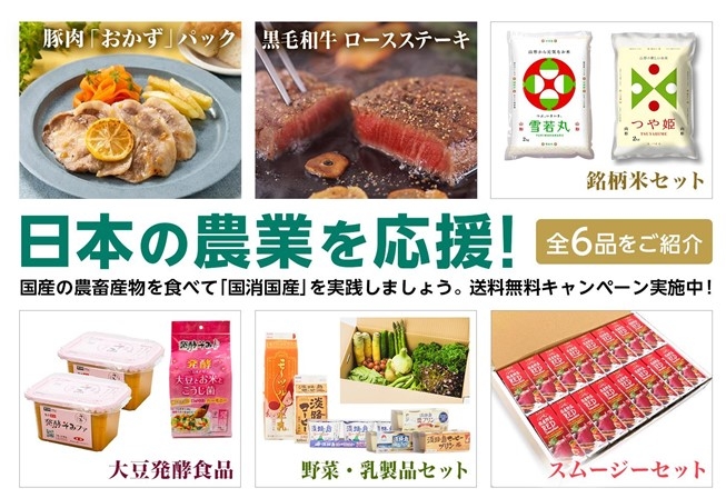 今回販売する商品は、黒毛和牛「極でか。ロースステーキ」、令和4年産山形県産「つや姫・雪若丸」のセット、超九州「おかず」のセット、国産野菜 赤と緑のスムージーセット、ほんまもん淡路島野菜とミルクお楽しみセット、発酵そみド&発酵そみファを数量限定で販売します。
