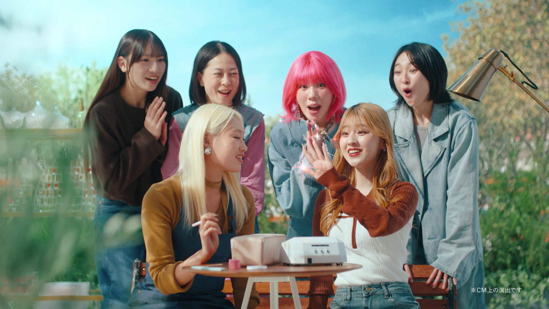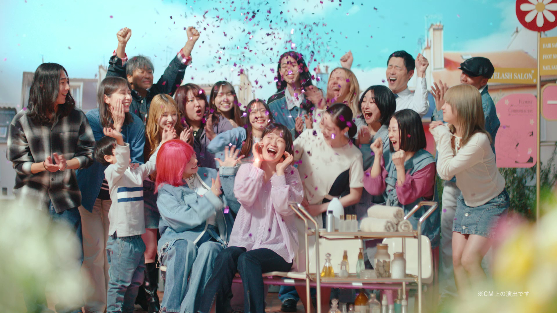 今回のCMは、ピンクヘアに大変身した仲さんや、それぞれのビューティーを楽しむ人たちをみんなで祝福するエキストラの方々とのハッピーな共演シーンも見どころです。老若男女幅広い世代の、約30人の演者が集まり、その中には元気な5歳の男の子の姿も。撮影の合間には、仲さんのきれいなネイルや重ね付けしたアクセサリーに興味津々。大人数で息を合わせる難しい撮影ではありましたが、共演者同士での交流も楽しみながら、和やかな雰囲気で撮影は進行しました。