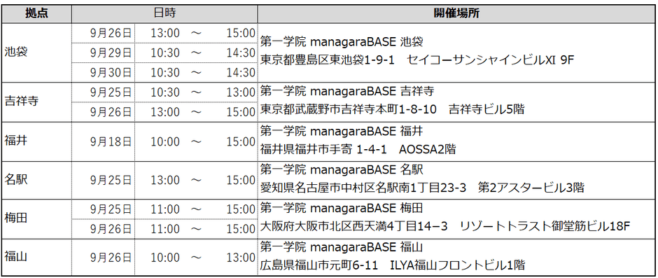 ※西宮北口と高松の2拠点では、今年度前期の実施はありません。