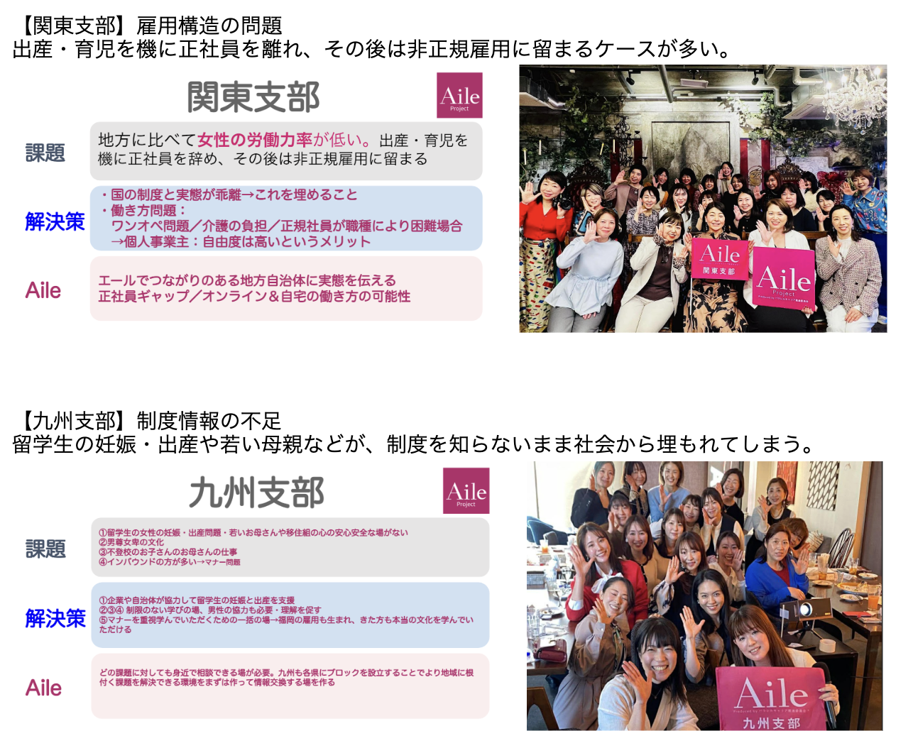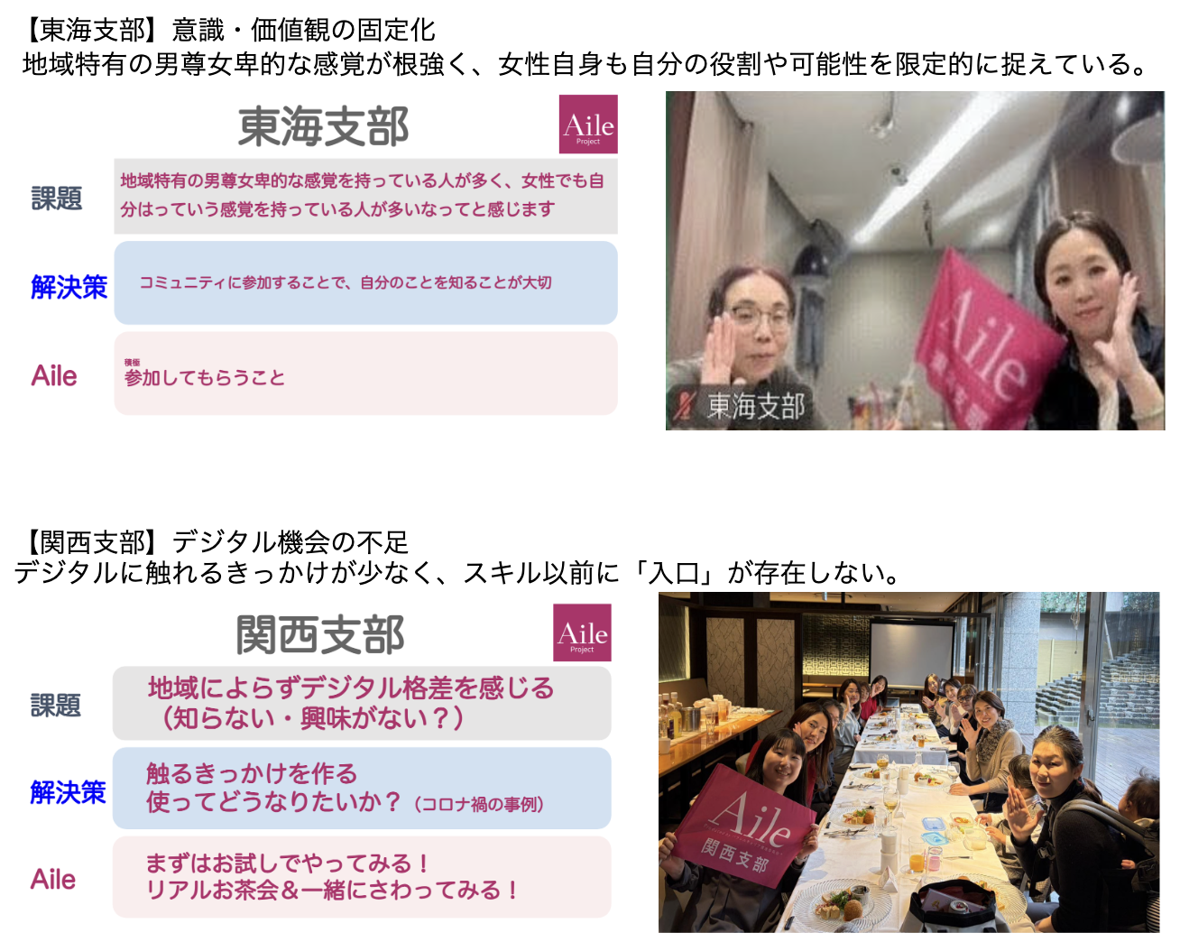 特に「地域創生×女性活躍」をテーマに各地域で抱えている問題を各支部で考え、その解決策とエールでできることは何か議論する場は、常々「地域創生」を重要テーマとして掲げていることもあり、それぞれの地域に住むメンバーだからこそ見える地域課題が浮かび上がる濃い時間となりました。