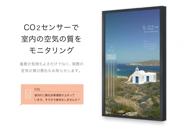 現行の27インチ液晶パネル搭載のAtmoph Windowに対して、大型モデルのAW501は縦横2倍、面積4倍のサイズに相当する55インチとなり、ついに搭載液晶パネルは4Kへと進化。ご家庭だけでなくオフィスや店舗、ホテルなどの広い場所でも、世界の風景をよりリアルな臨場感で体験することができます。また、このAW501はAtmoph Windowで初めてCO2センサーを搭載し、空気の質をモニタリングします。本物の窓のように窓が開いて換気することはできませんが、CO2濃度に合わせて換気を促してくれます。視覚による癒しと開放感の提供に加え、室内環境の心地よさを一層向上させる製品が誕生しました。