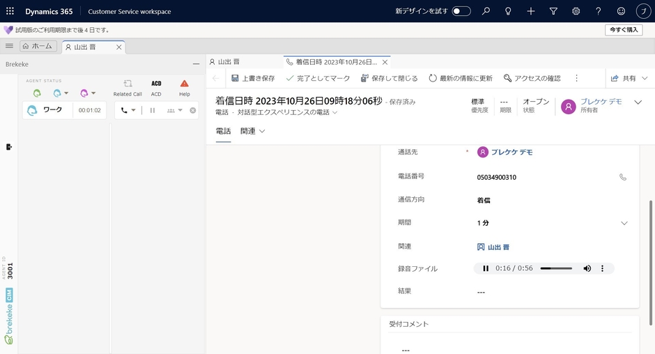 ・通話録音を含めた履歴が自動的に「Dynamics 365 Customer Service」のカスタマーワークスペースに記録されます。