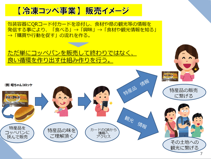 また、冷凍化によって全国に流通させられるようになる「ご当地コッペ」のパッケージに「QRコード付きカード」をつけることで、実際に味わってもらった山口の特産品、食材の魅力などにより親しんでもらう仕掛けをし、「ご当地コッペ」から地域活性化を目指します。