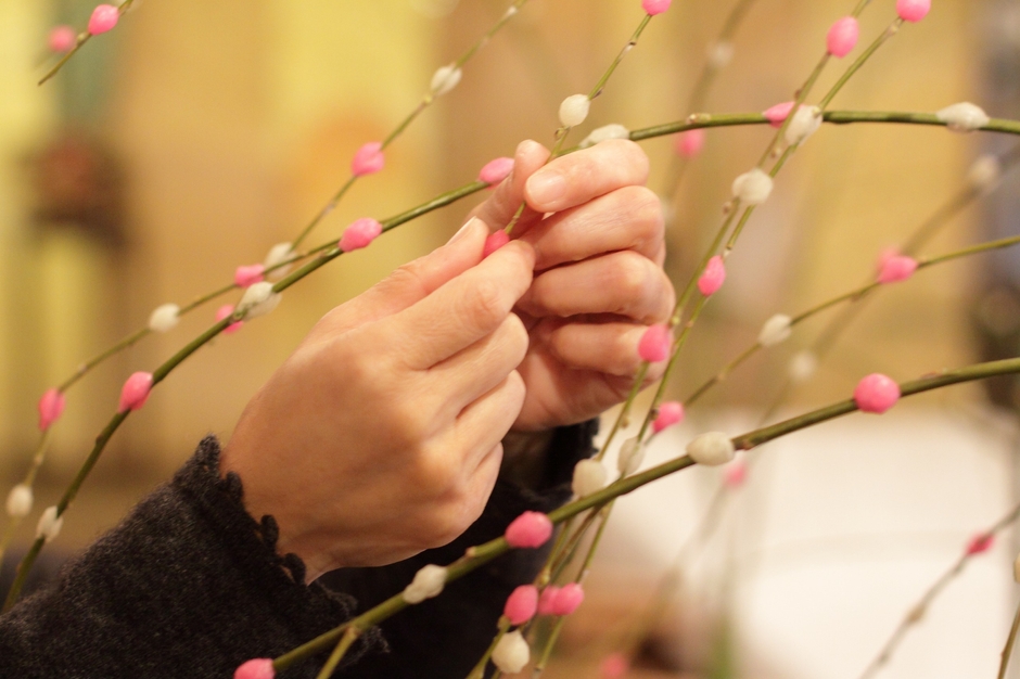 寿長生の郷で行う餅花づくりは、枝ぶりのよい柳と着色料で色をつけた赤いお餅と白いお餅をご用意し、枝へ交互に付けていただいて完成です。今年で約20年となるイベントは毎年リピーターのお客様も多く、昨年は約1,500名のお客様がご参加されています。