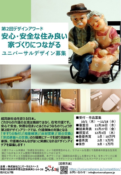 介護向け住宅リフォーム事業を行う株式会社ユニバーサルスペース(本社:神奈川県横浜市、代表取締役:遠藤 哉)は、10月25日で締め切った第2回デザインアワード『安心・安全な住み良い家づくりにつながるユニバーサルデザイン』を10月26日より再募集を開始します。