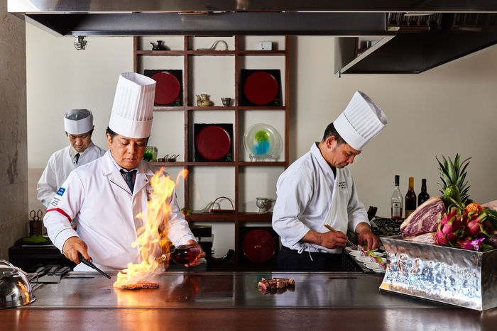 目の前で調理を行うライブキッチンでは、香ばしい香りと音、出来たての美味しさをその場で楽しめる鉄板焼き料理をご提供いたします。ディナーの鉄板焼きコースで使用する厚さ5センチ、長さ1メートルの本格鉄板を使い、シェフがお客様の目の前で焼き上げます。