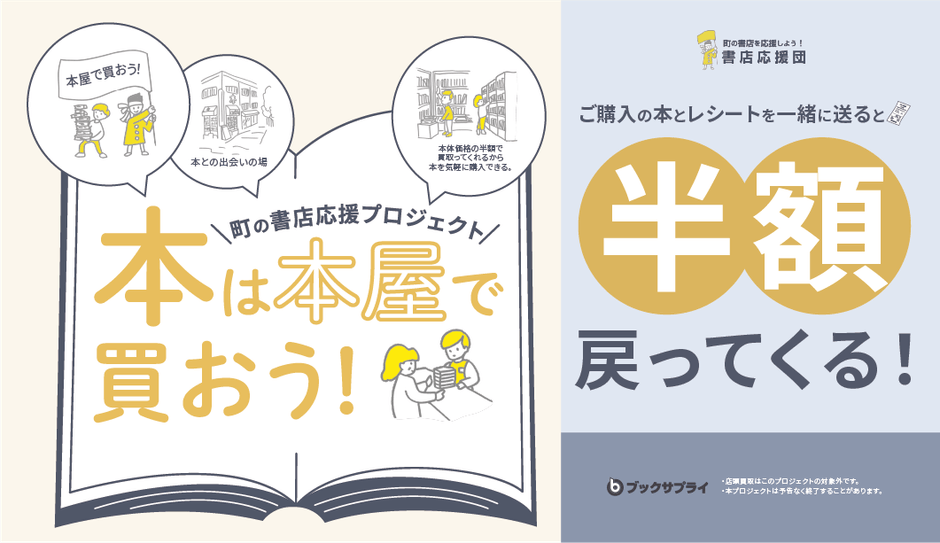 累計2,000万人以上の利用者を持つ宅配買取サービスを展開する株式会社ブックサプライは、インターネットの台頭により全国で書店を取り巻く環境が厳しくなる中、書店文化を絶やさないために「今できること」へ取り組む『書店応援団』を立ち上げました。今回の町の書店応援プロジェクトは『本は本屋で買おう!』をコンセプトに、全国の約8,000店舗の書店が対象となる、全国初(※2023年5月当社調べ)の『本屋さんで新刊本を購入することで半額が戻ってくるキャンペーン』を実施します。